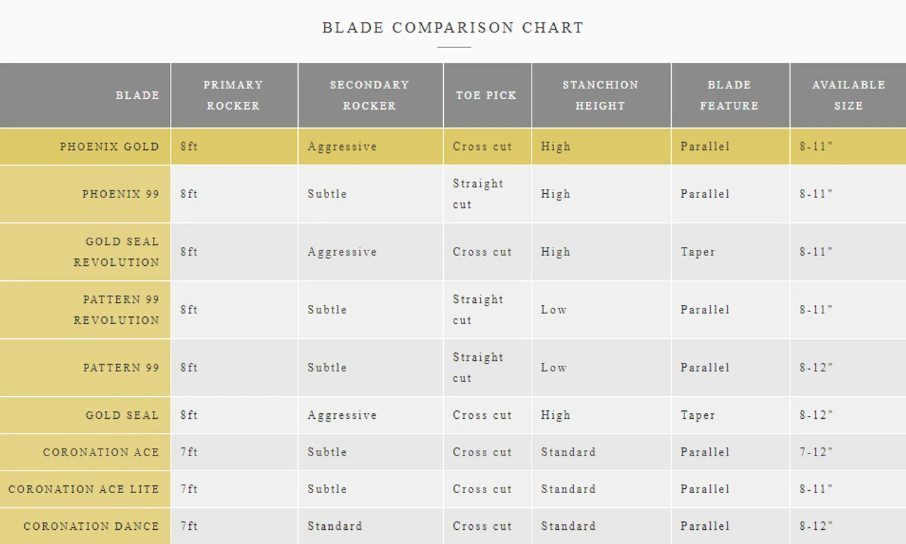 The Parallel Blades have the same blade runner thickness from the rake of the blade down the total length of the blade to the blade tail. Parallel blades are the most common of blades.
